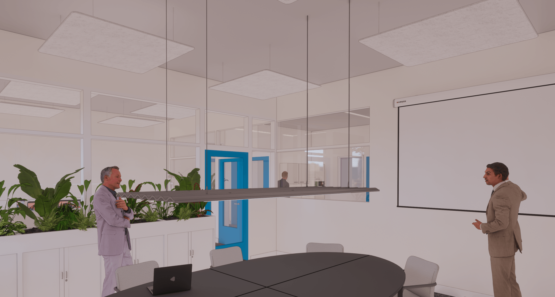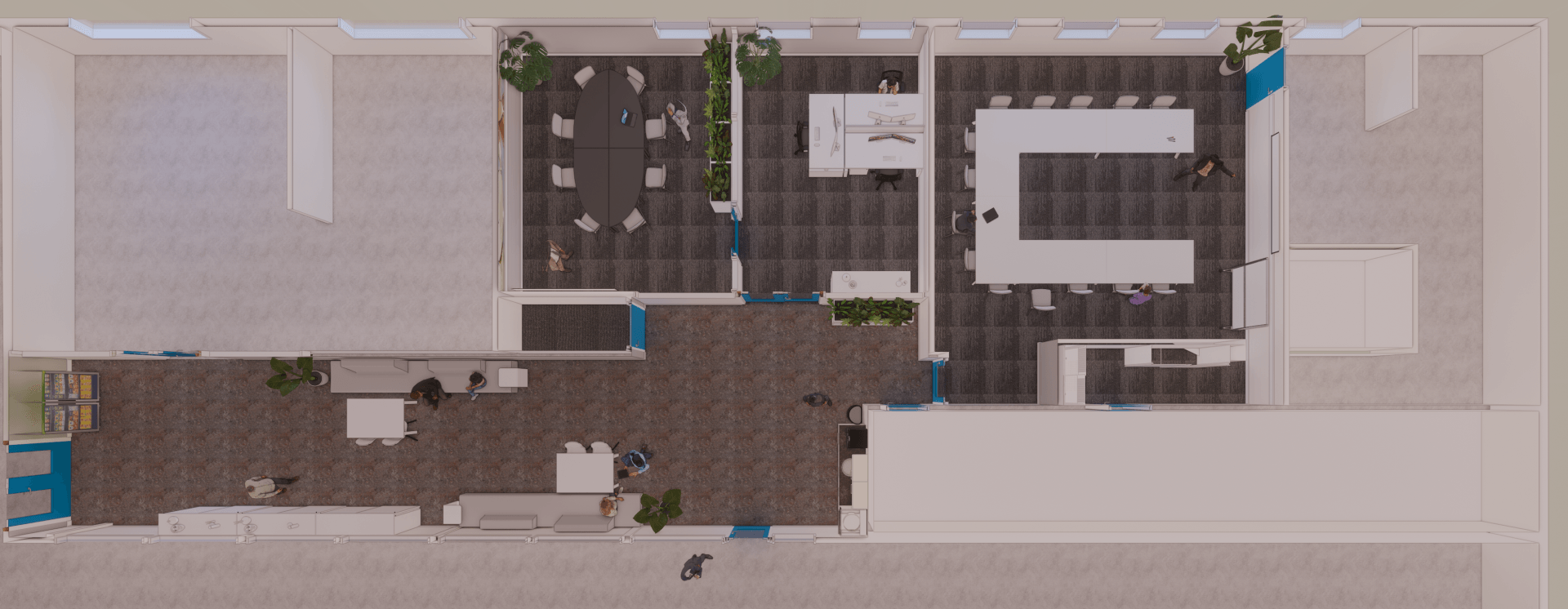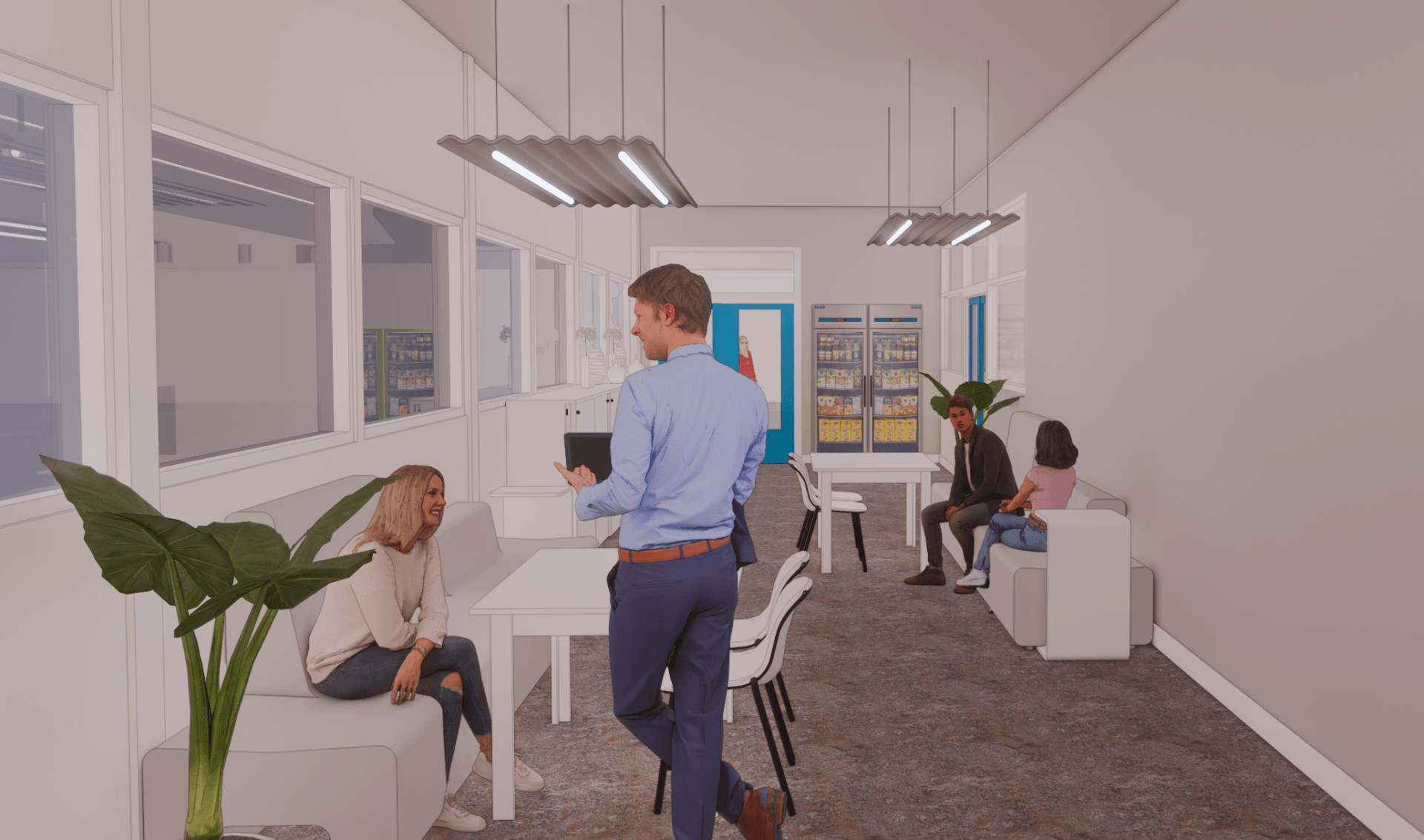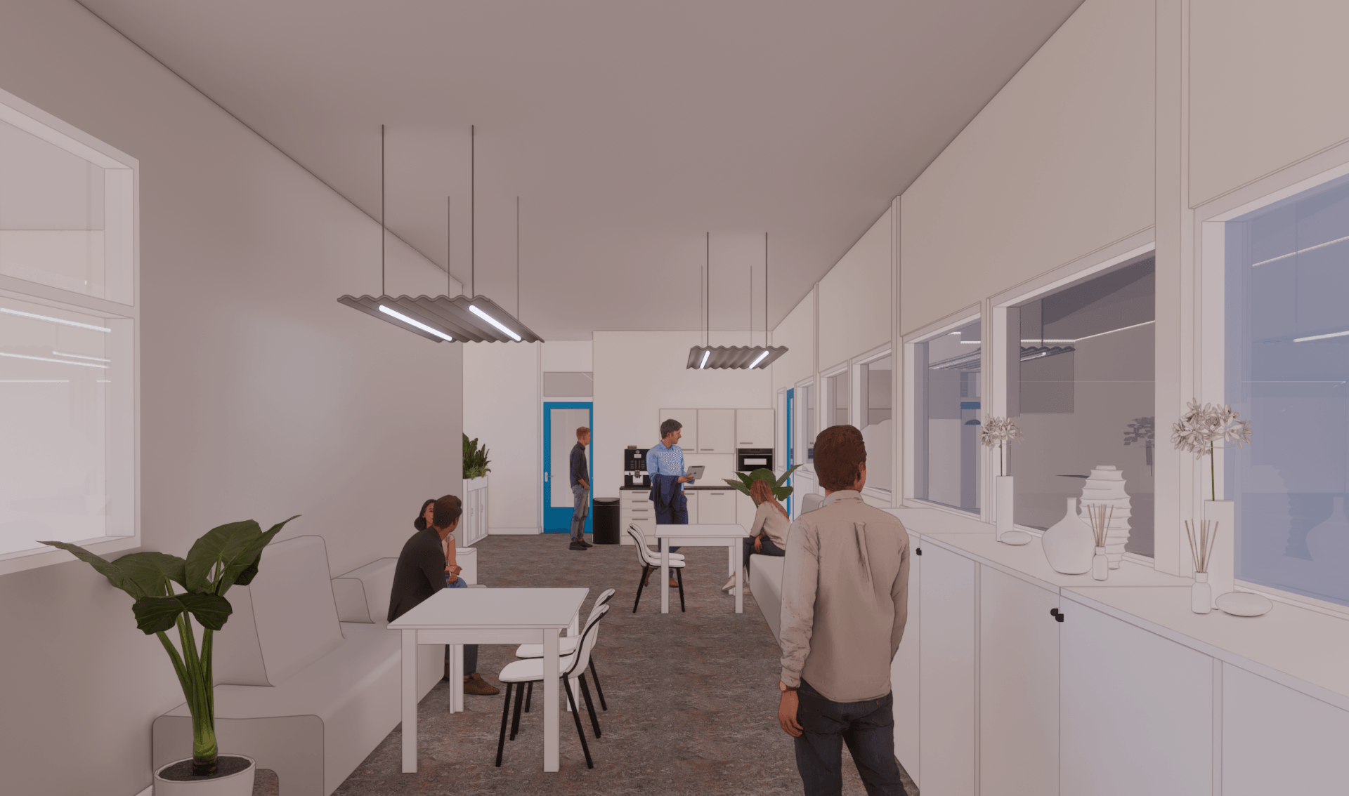De circulatie was een uitdaging in deze ruimtes, zo is er een gezamenlijke hal waar de lunch voor ca. 16 personen moet worden voorzien. Om hier een fijne beleving neer te zetten ondanks de circulatie die hier dwars door heen loopt, was een uitdaging. Echter heeft Studio Knott dit gecreëerd door een asymmetrische zit met afwisselend hoge en minder hoge rugleuningen toe te voegen.