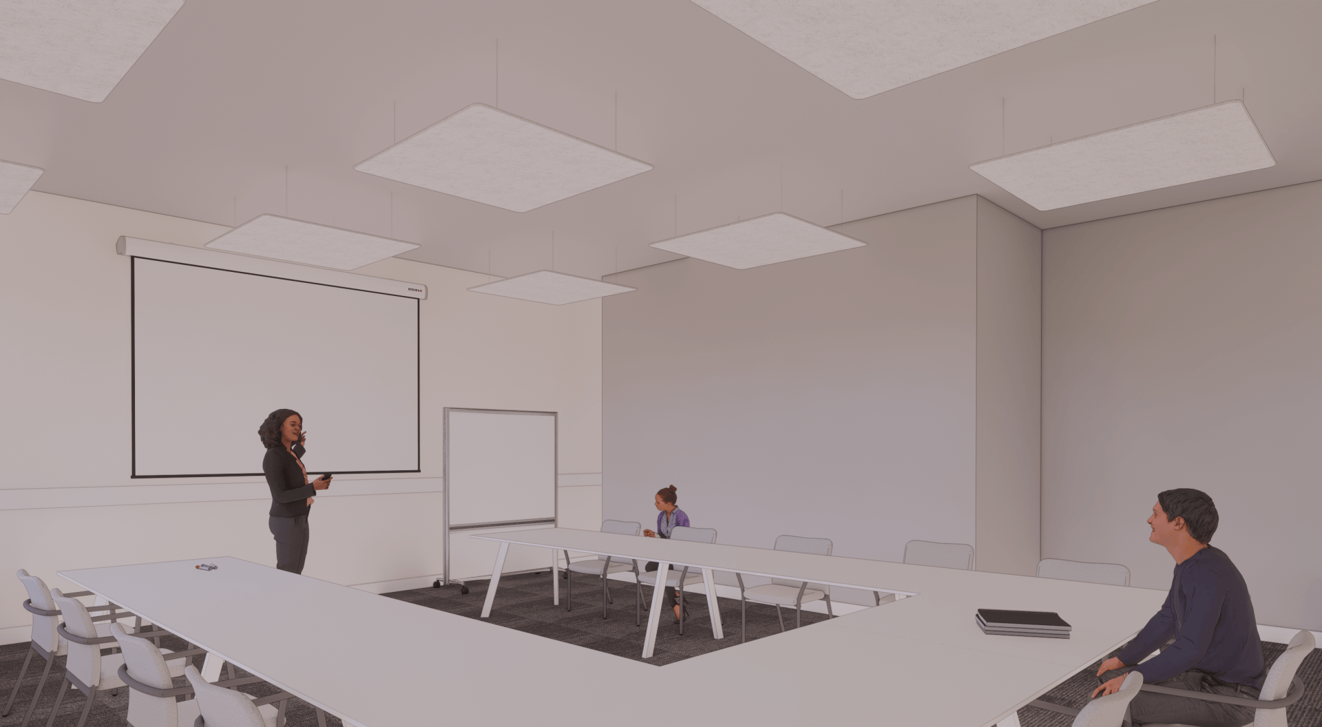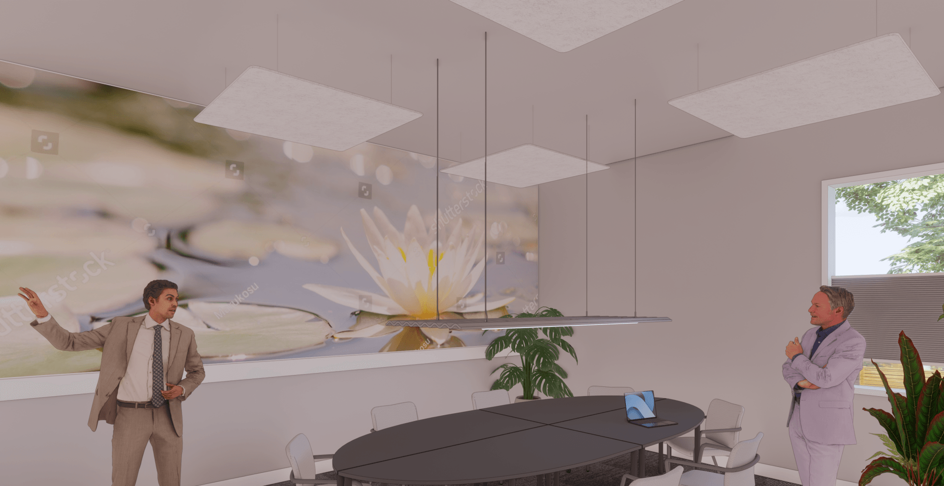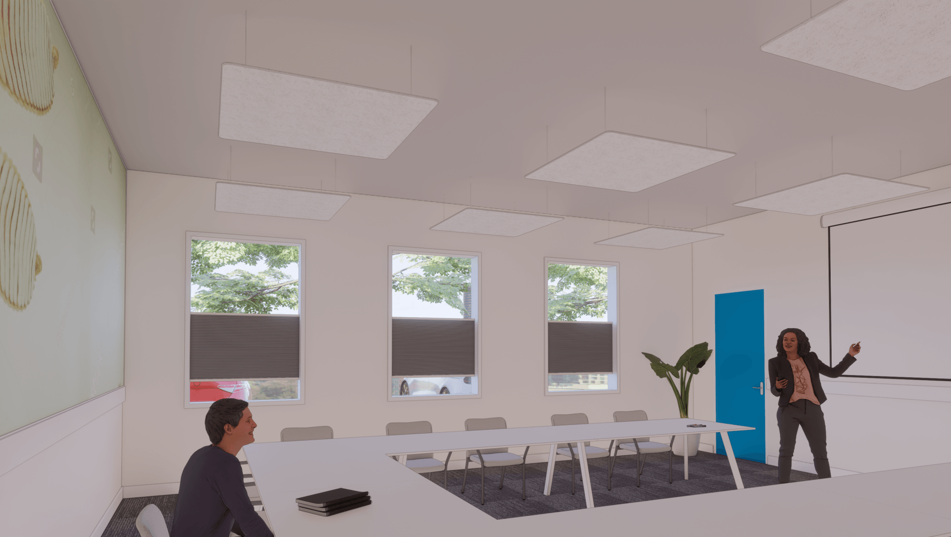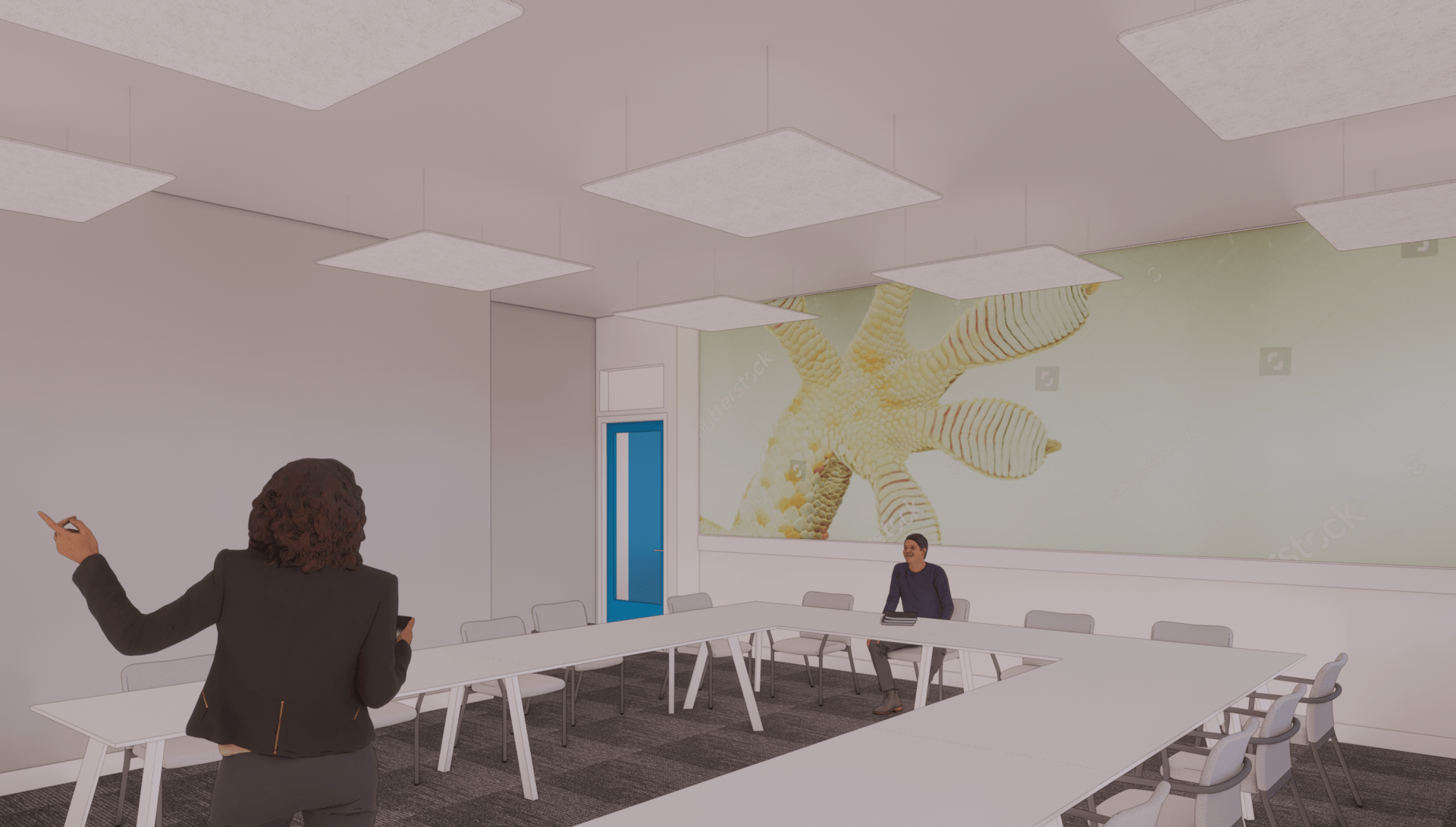 In de vergaderruimte ziet u een bijzondere visual op de wand. Dit is een van de thema’s die als uitdaging wordt gezien binnen de branche. Zo ook de poot van de gekko in het les lokaal. Beide zijn echt een eyecather in de informatie gerichte ruimtes. Op deze manier ontstaat er op een rustige manier toch interactie tussen het interieur en de lesstof.