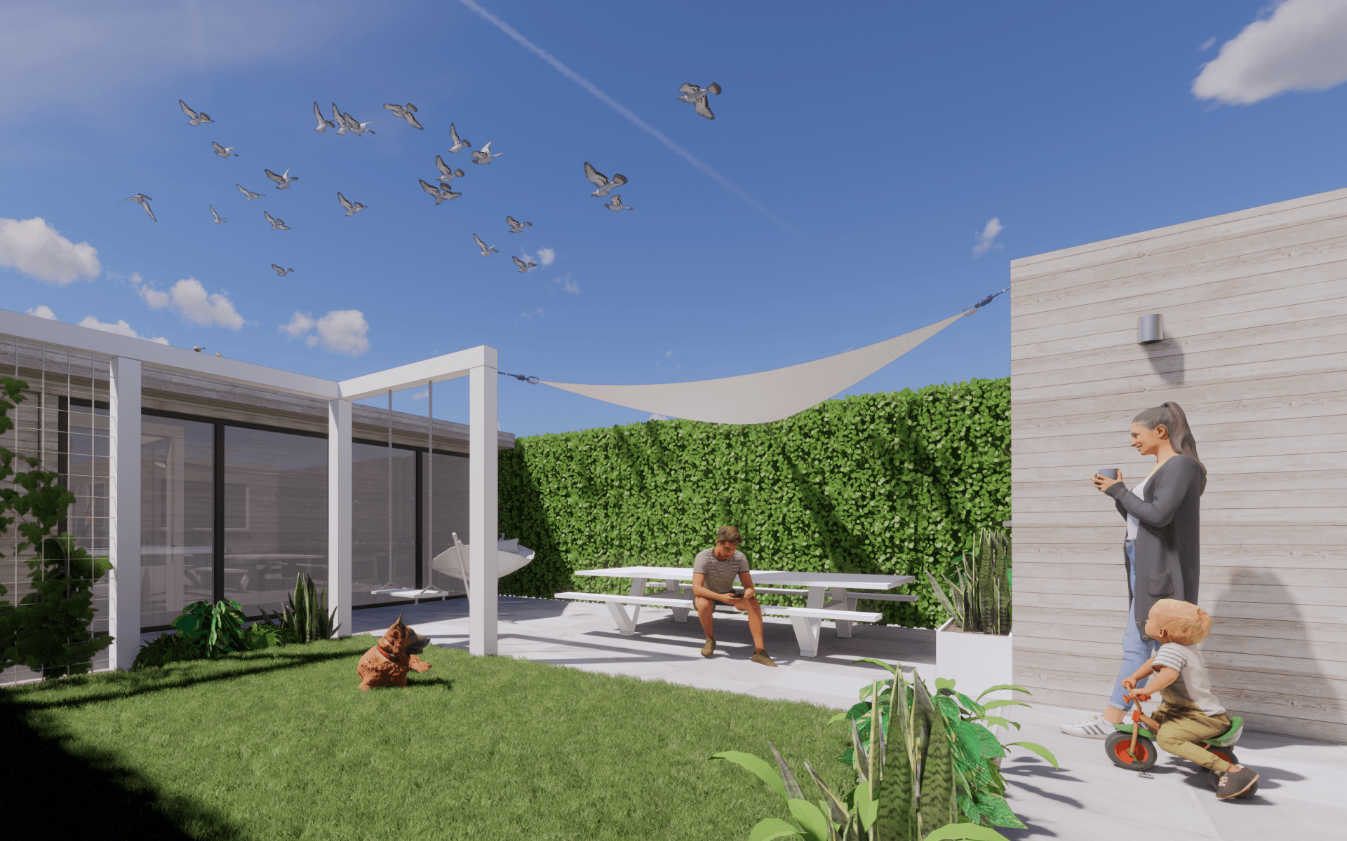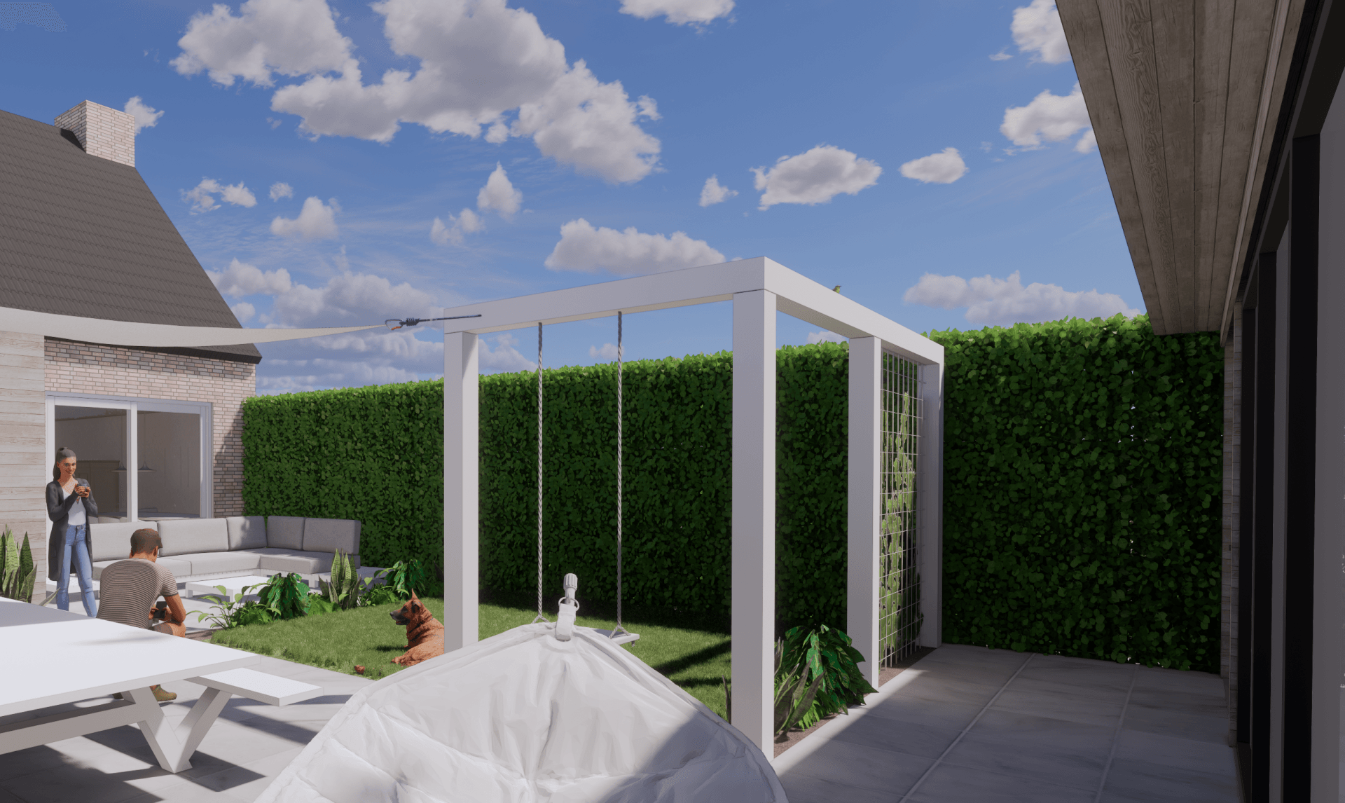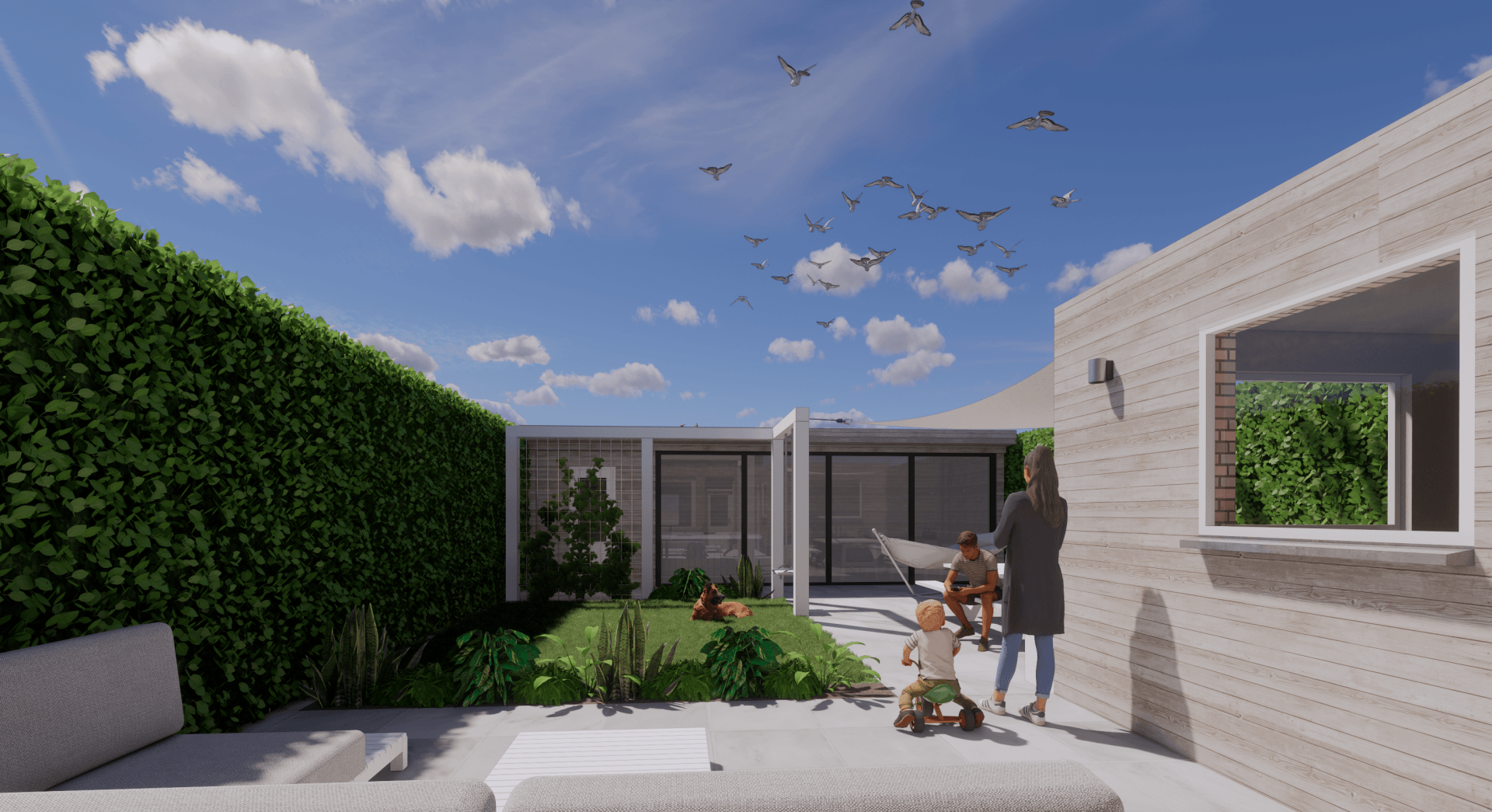 Voor deze tuin is Studio Knott begonnen met het inzichtelijk krijgen wat betreft de lichtinval, wat natuurlijk een van de belangrijkste dingen in een tuin is. Hier vandaan hebben ze het opgedeeld en circulatie gecreëerd. Het bestaande terras bij het huis kon worden behouden, wat dan weer kosten besparend was. Door de palen in de tuin geeft het vele mogelijkheden tot het ophangen van bijvoorbeeld een schommel of een hangmat. Natuurlijk kon een stukje gras niet ontbreken, dit maakt de tuin speels en zorgt voor een mooie plek voor de hond.