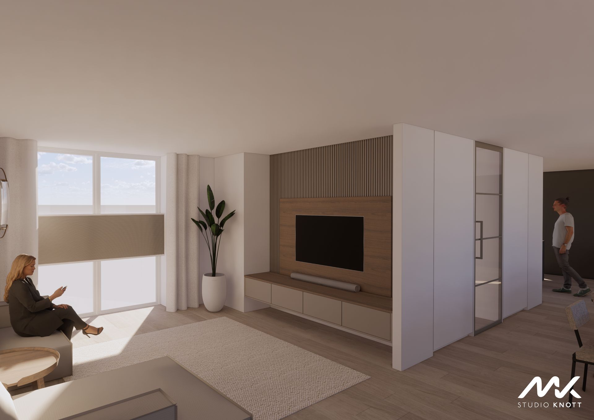 gemaakt van de nis in de bouwkundige situatie, hier zouden jullie een strak tv meubel op maat kunnen maken. Verder heb ik in de aanbouw gekozen voor een fijne zit plek waar men tot rust kan komen, kijkend richting de achtertuin.