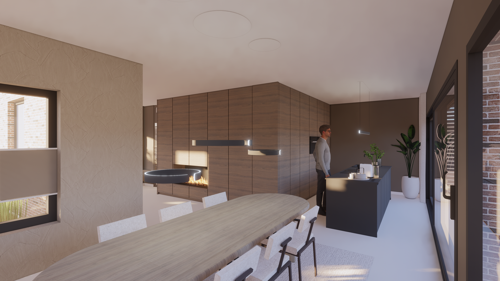 Studio Knott heeft ervoor gekozen met een doorlopende kastenwand te werken die met een openhaard sfeer geeft bij de zithoek en die in de keuken apperatuur bevat.