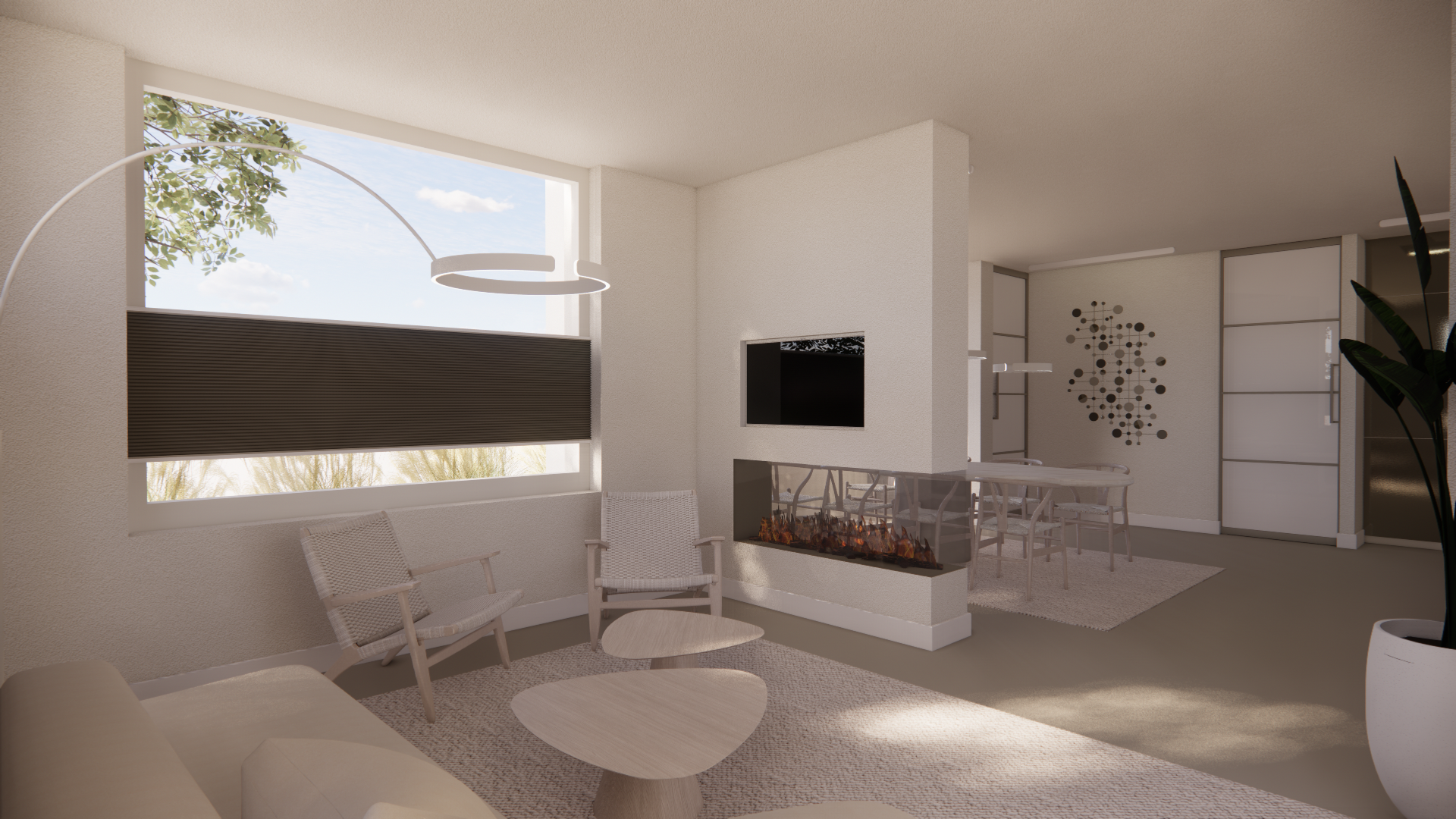 Studio Knott heeft ervoor gekozen met een een grote inbouw kastenwand te werken. Ook de openhaard is toegevoegd. In de zithoek zijn al de kabels etc netjes weg gewerkt door middel van een nis in de wand. Ook wilde de opdrachtgevers graag een gietvloer, hierdoor heb ik met houtsoorten en warme kleuren gewerkt om de huiselijke sfeer in het ontwerp te krijgen.